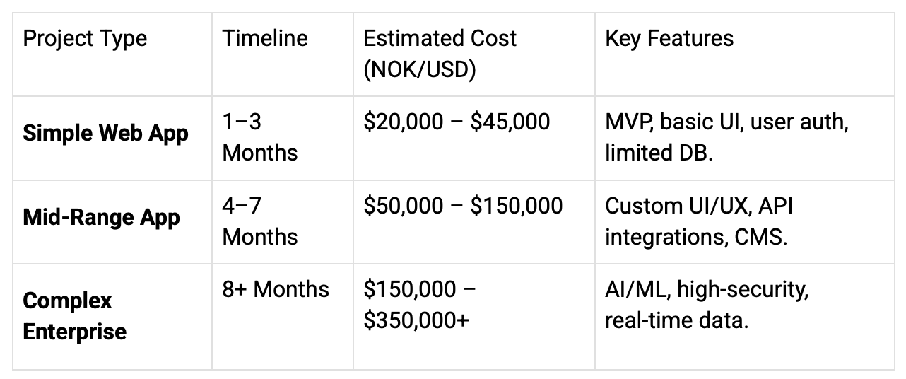 Planning a web project? Discover the cost drivers for web application development in Norway, from MVP pricing to enterprise solutions.